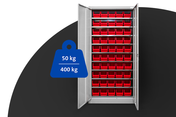 • 10 Fachböden mit einer Traglast von jeweils bis zu 50 kg. Die Feldlast des Schranks liegt bei beachtlichen 400 kg*